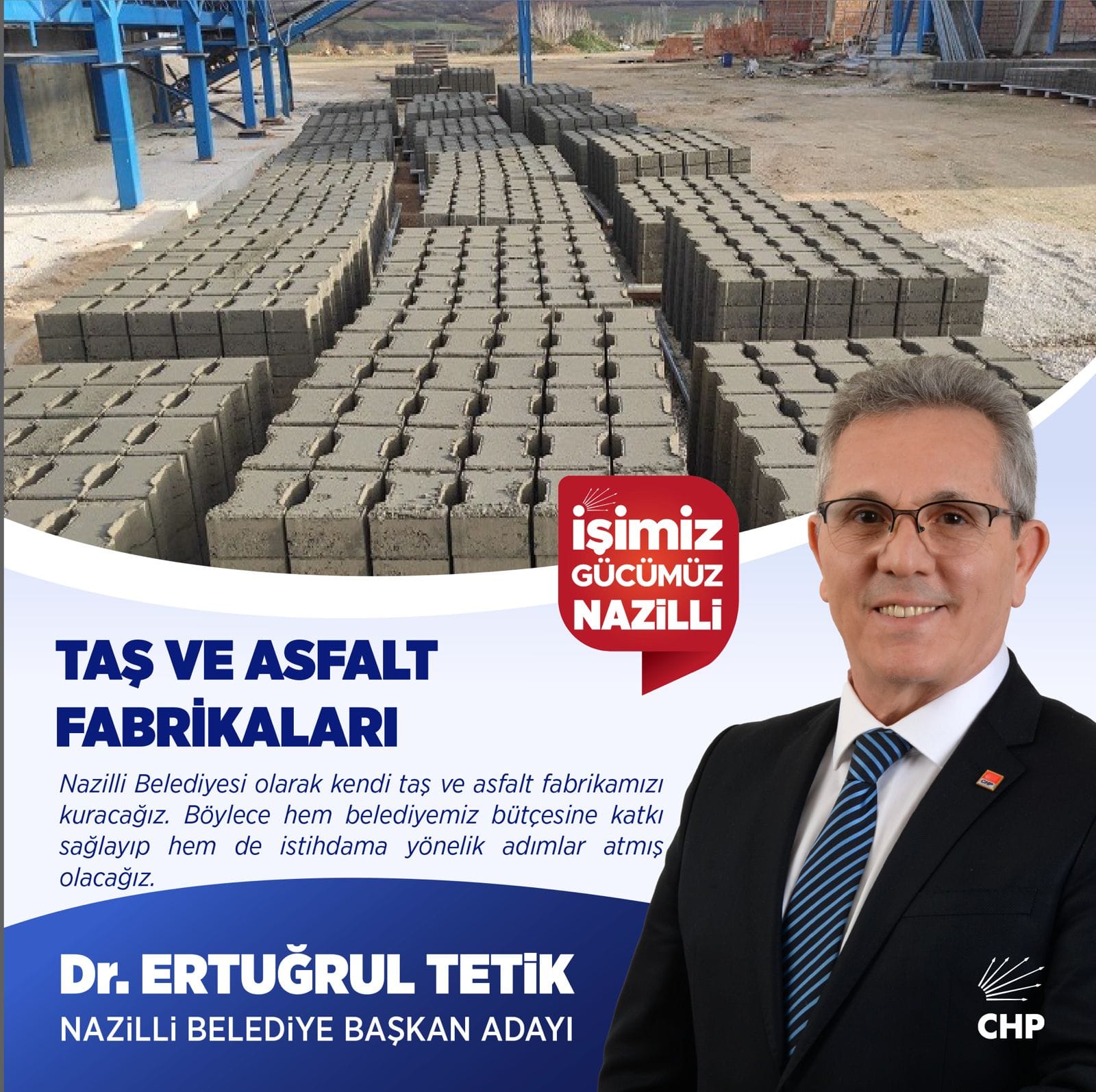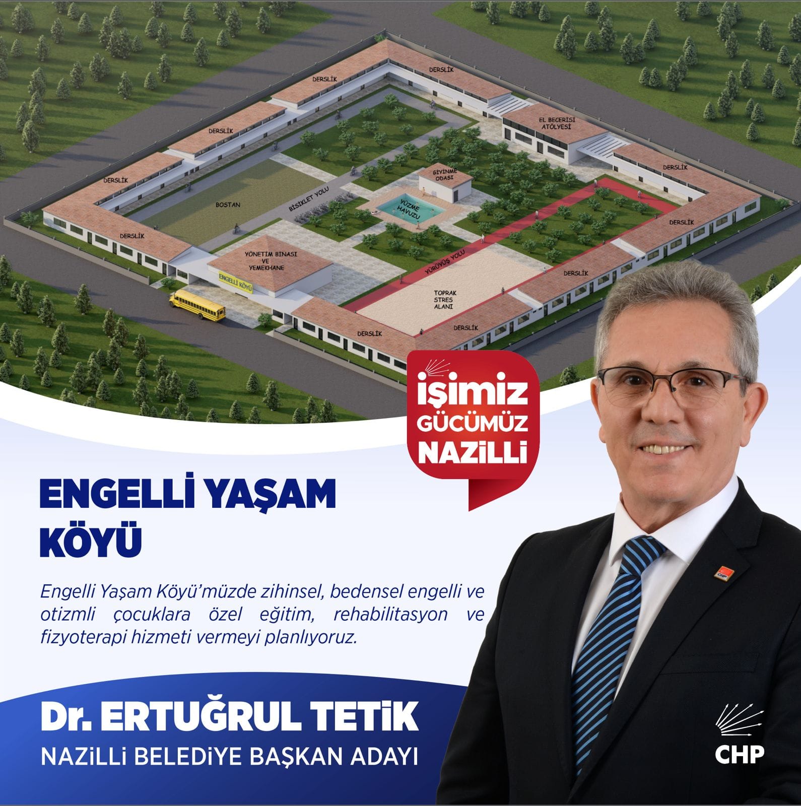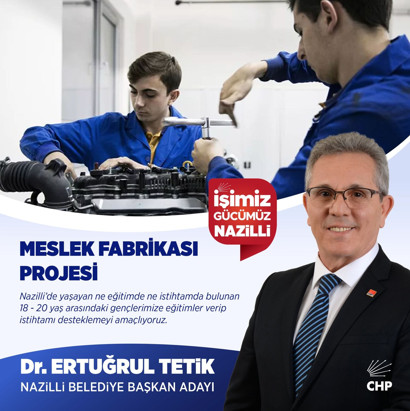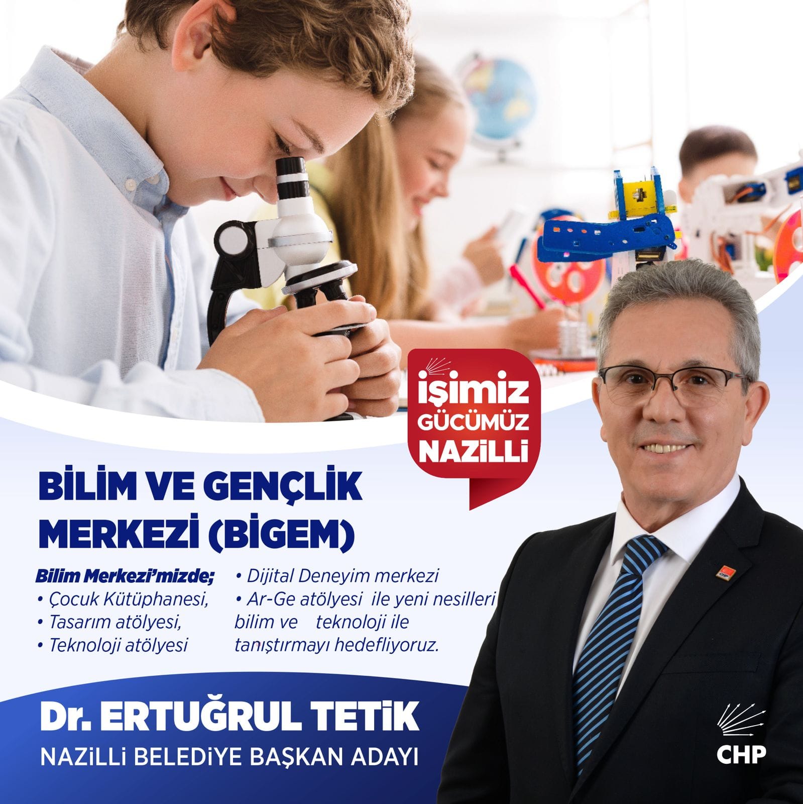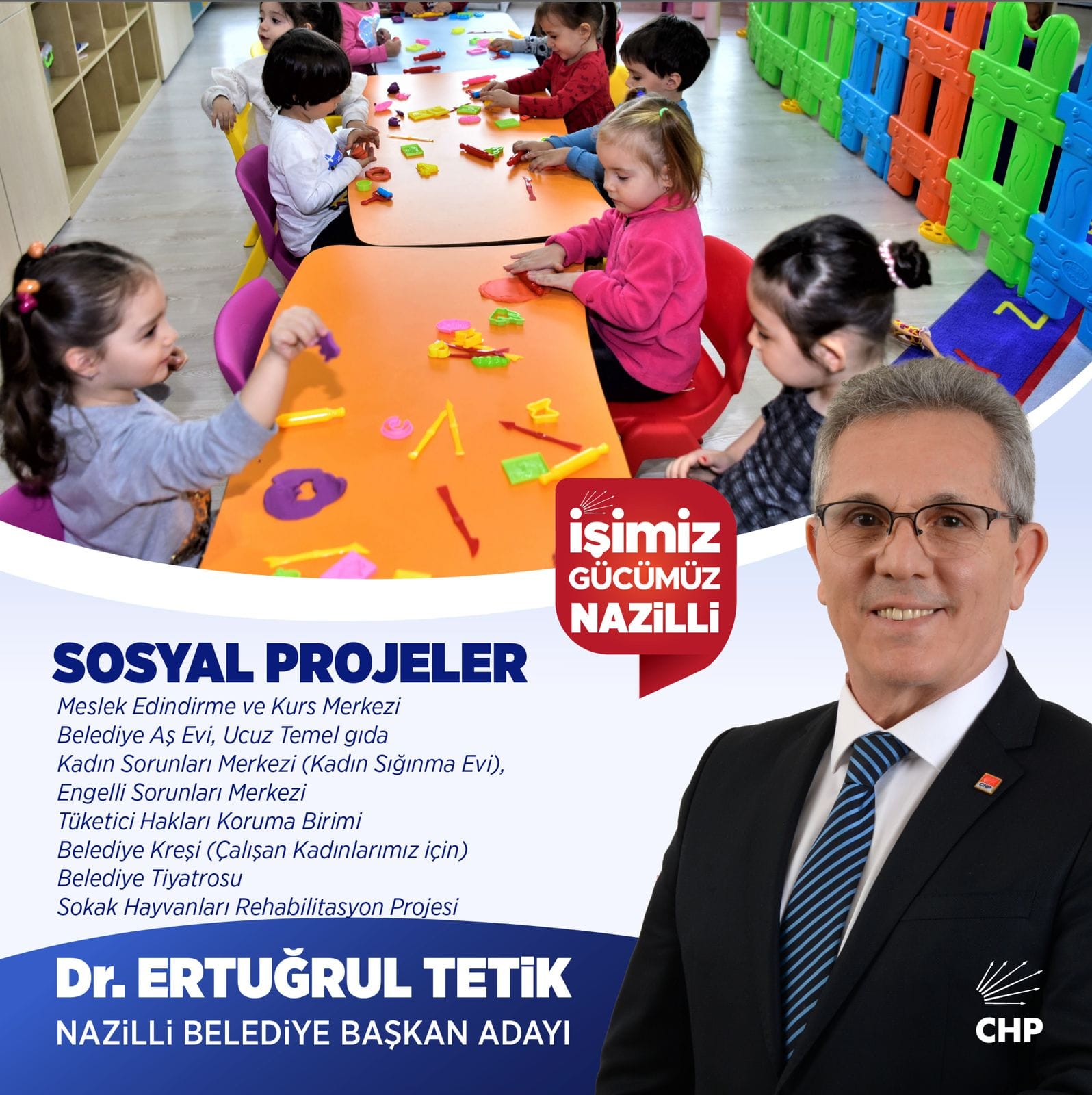 Yerel seçimlere 10 gün kala CHP Nazilli Belediye Başkan Adayı Ertuğrul Tetik projelerini açıkladı.Nazilli’yi daha modern bir şehir haline getirmek için titizlikle hazırlanan projeler ile ilgili son detaylar geçtiğimiz akşam İlçe Binasında yapılan toplantı ile gerçekleştirildi.Toplantı sonrası Tetik projelerini kamuoyu ile paylaştıİşte Ertuğrul Tetik’in ProjeleriAtatürk Kongre Merkezi, Taş ve Asfalt Fabrikası, Engelli yaşam köyü, Hayvan Dostu Merkezi, Sokak Lambaları ve Pazar yeri Projesi GES, Hoş Geldin Bebek, Mobil Sağlık Aracı, Refakatçi hizmeti, Bilim ve Gençlik Merkezi BİGEM, Gıda kart Eğitim Kart Projesi, NABEL meyve suyu fabrikası, Meslek fabrikası projesi, iş geliştirme merkezi, Gençlik Merkezi, Park ve Trafik sorunu, Engelsiz şehir ve Ulaşım, Afet yönetim Merkezi AYM, Nazım İmar Planı ve Çağdaş toplu konutlar, Organize Sanayi Bölgesi, Çevreci Belediye, Halkın Meclisi, Sosyal Projeler, Spor Desteği Projesi, Emekli ve Yaşlı Evleri, Kadın Sığınma Evi, Uzun yaşam Festivali, Ata Tohumu Takas Festivali, Kentpark, (Sümerpark) Mesire alanları,