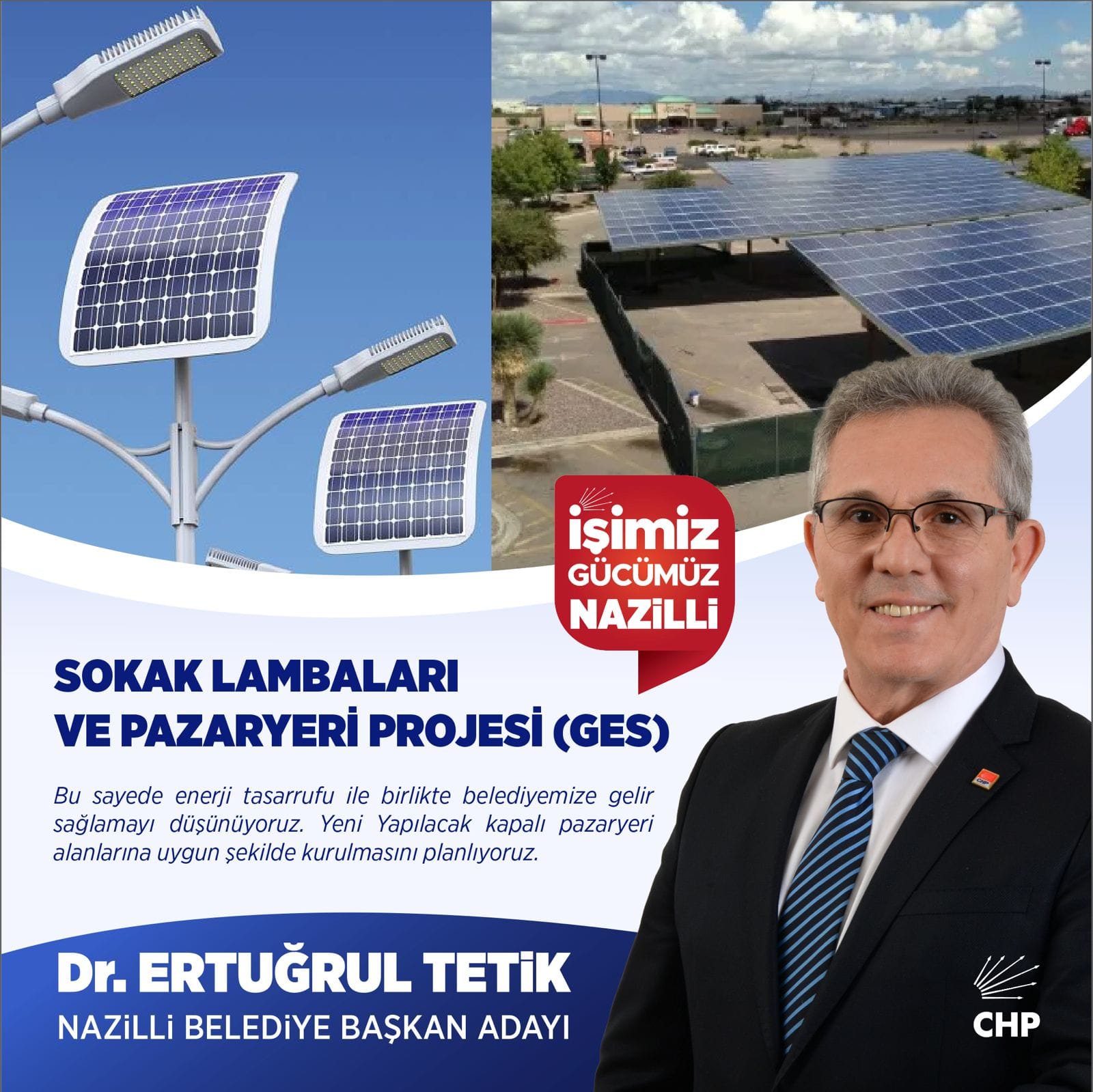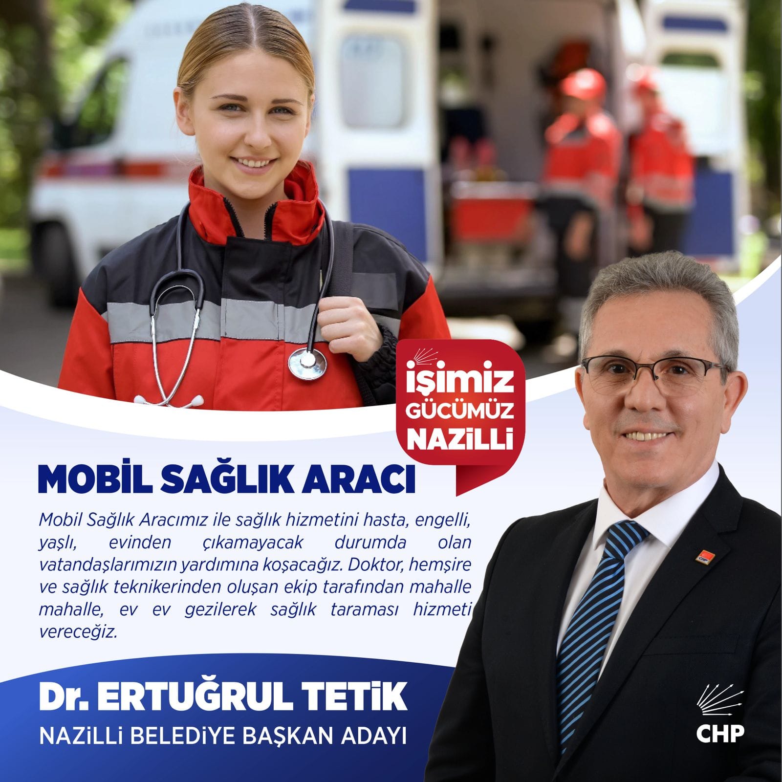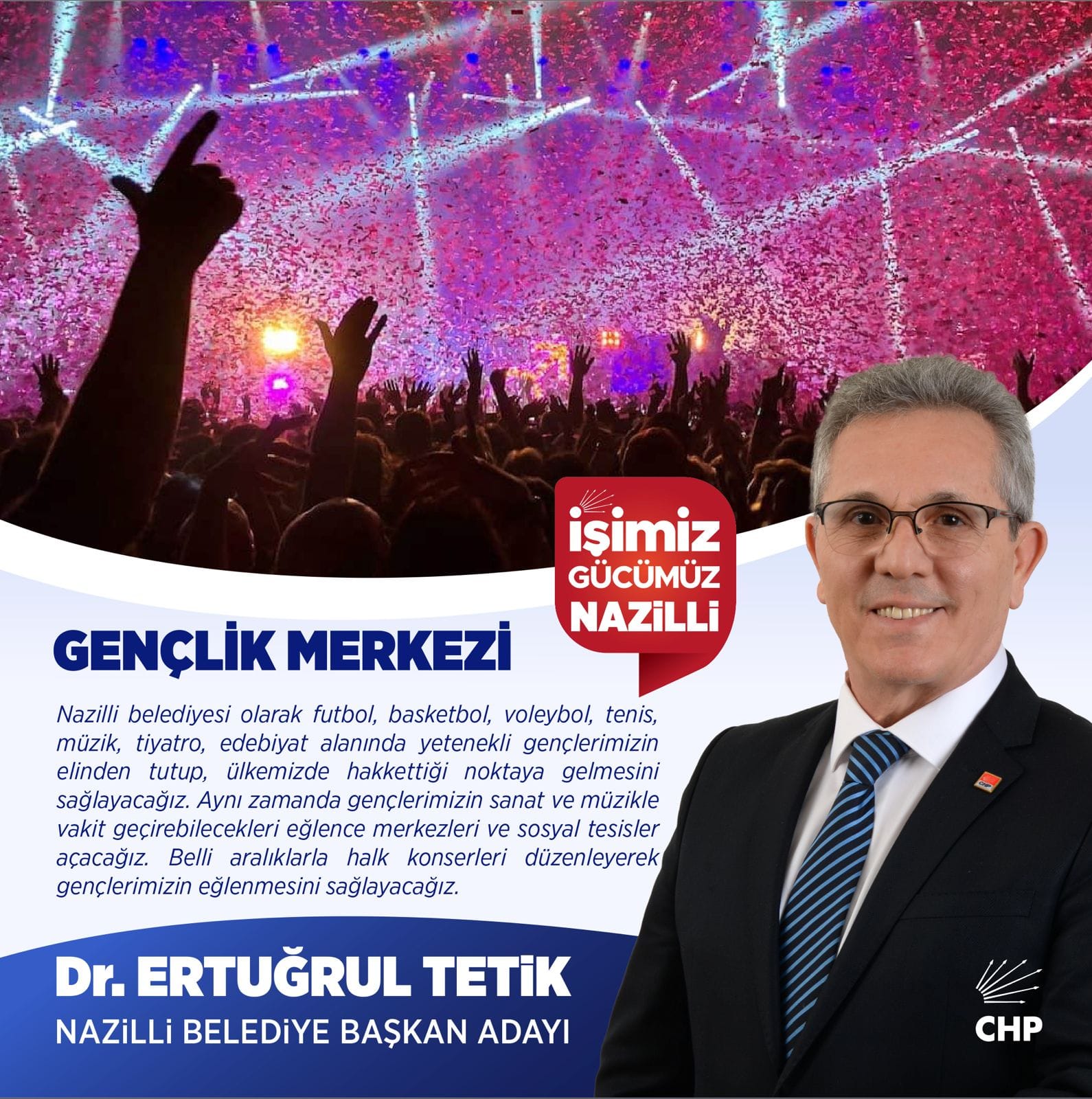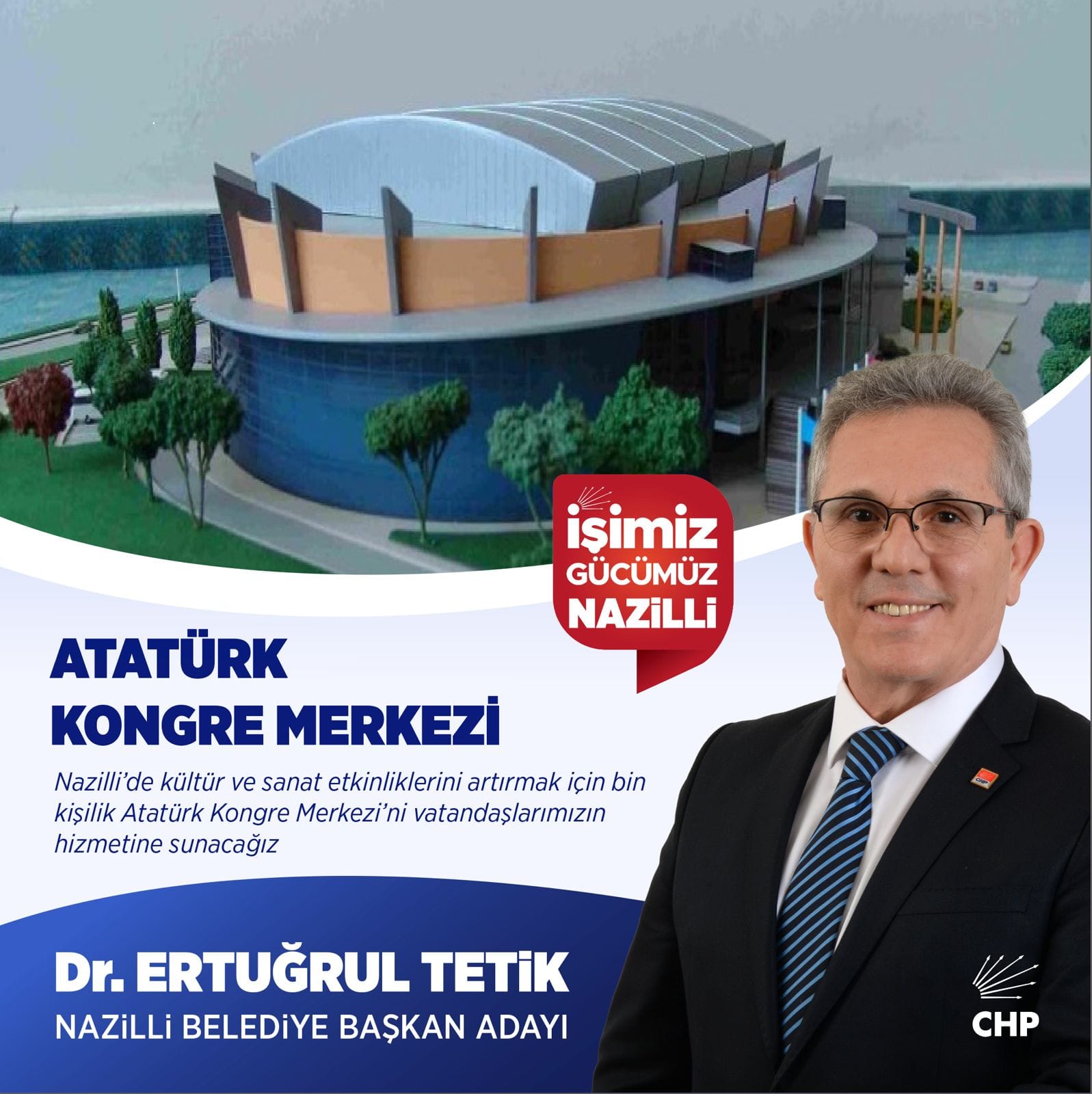 Yerel seçimlere 10 gün kala CHP Nazilli Belediye Başkan Adayı Ertuğrul Tetik projelerini açıkladı.Nazilli’yi daha modern bir şehir haline getirmek için titizlikle hazırlanan projeler ile ilgili son detaylar geçtiğimiz akşam İlçe Binasında yapılan toplantı ile gerçekleştirildi.Toplantı sonrası Tetik projelerini kamuoyu ile paylaştıİşte Ertuğrul Tetik’in ProjeleriAtatürk Kongre Merkezi, Taş ve Asfalt Fabrikası, Engelli yaşam köyü, Hayvan Dostu Merkezi, Sokak Lambaları ve Pazar yeri Projesi GES, Hoş Geldin Bebek, Mobil Sağlık Aracı, Refakatçi hizmeti, Bilim ve Gençlik Merkezi BİGEM, Gıda kart Eğitim Kart Projesi, NABEL meyve suyu fabrikası, Meslek fabrikası projesi, iş geliştirme merkezi, Gençlik Merkezi, Park ve Trafik sorunu, Engelsiz şehir ve Ulaşım, Afet yönetim Merkezi AYM, Nazım İmar Planı ve Çağdaş toplu konutlar, Organize Sanayi Bölgesi, Çevreci Belediye, Halkın Meclisi, Sosyal Projeler, Spor Desteği Projesi, Emekli ve Yaşlı Evleri, Kadın Sığınma Evi, Uzun yaşam Festivali, Ata Tohumu Takas Festivali, Kentpark, (Sümerpark) Mesire alanları,