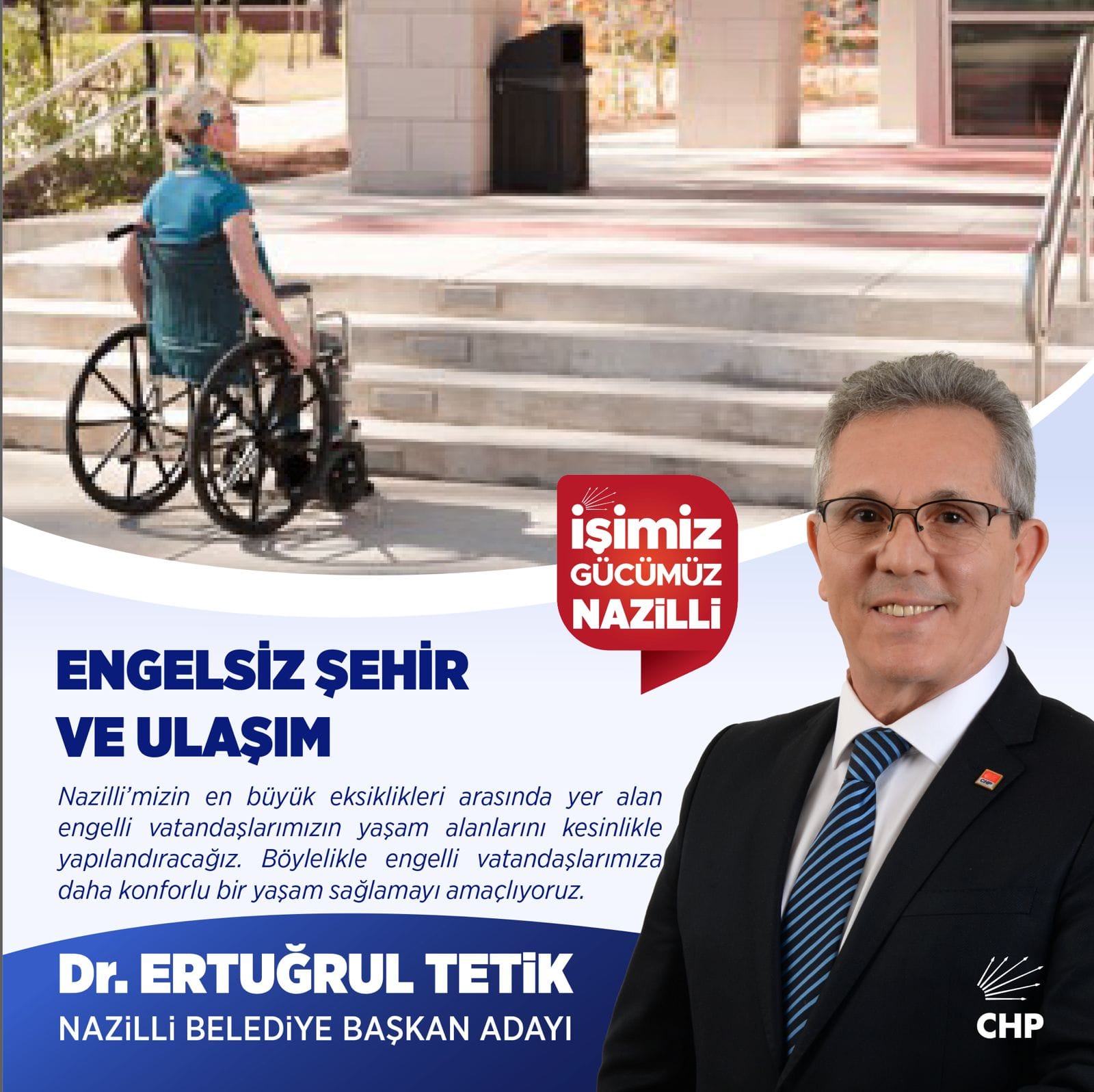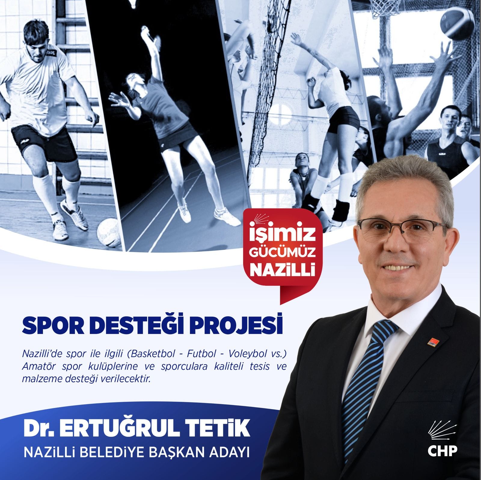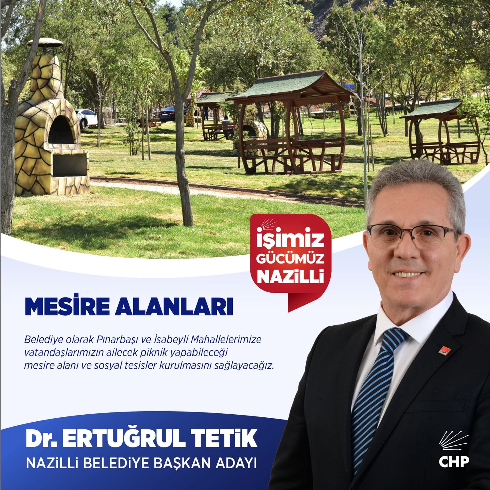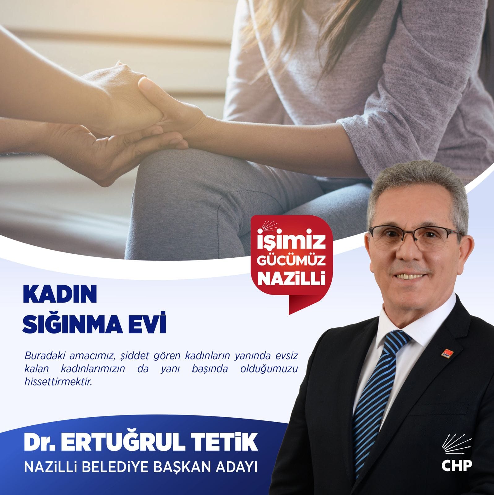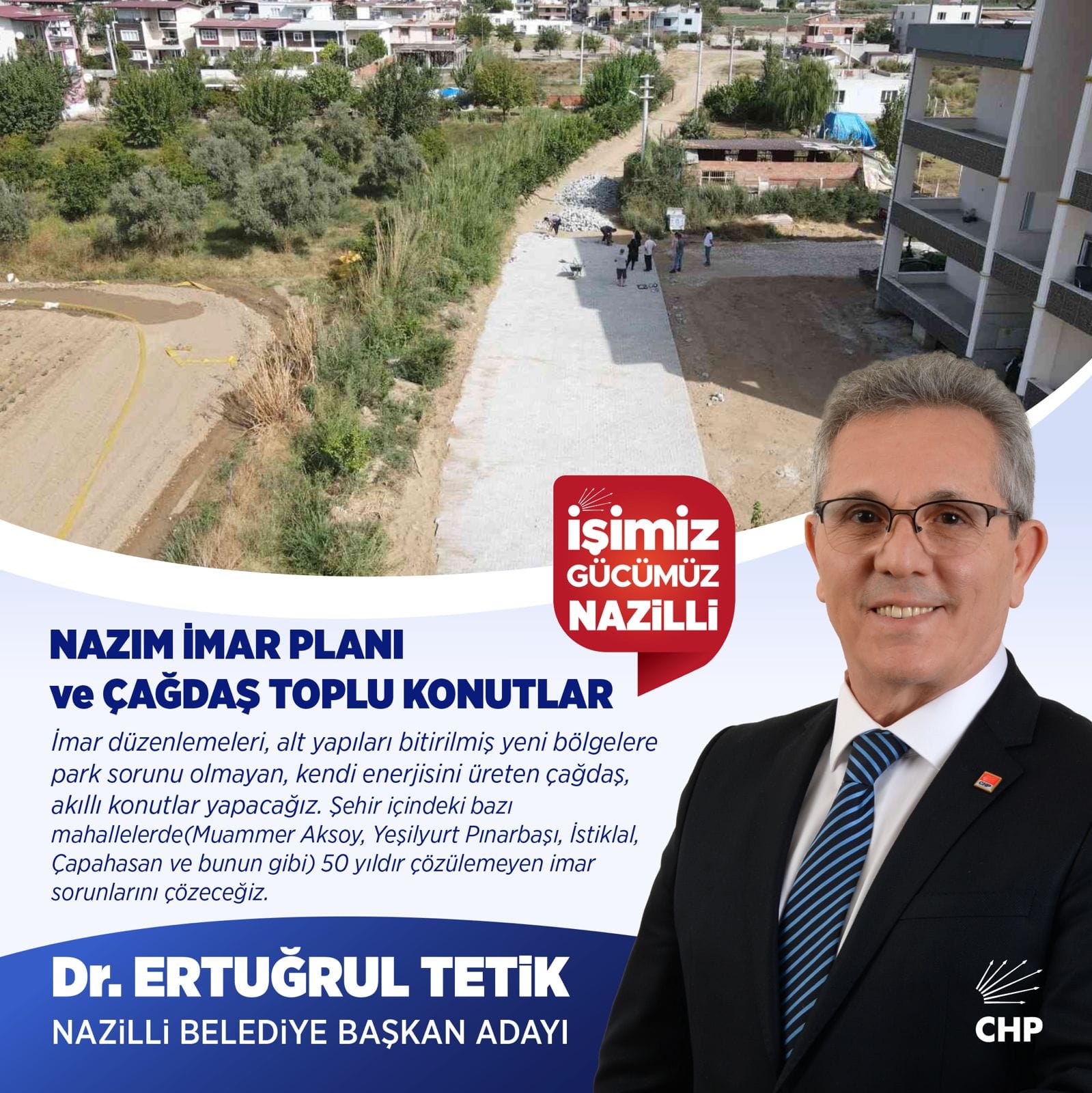 Yerel seçimlere 10 gün kala CHP Nazilli Belediye Başkan Adayı Ertuğrul Tetik projelerini açıkladı.Nazilli’yi daha modern bir şehir haline getirmek için titizlikle hazırlanan projeler ile ilgili son detaylar geçtiğimiz akşam İlçe Binasında yapılan toplantı ile gerçekleştirildi.Toplantı sonrası Tetik projelerini kamuoyu ile paylaştıİşte Ertuğrul Tetik’in ProjeleriAtatürk Kongre Merkezi, Taş ve Asfalt Fabrikası, Engelli yaşam köyü, Hayvan Dostu Merkezi, Sokak Lambaları ve Pazar yeri Projesi GES, Hoş Geldin Bebek, Mobil Sağlık Aracı, Refakatçi hizmeti, Bilim ve Gençlik Merkezi BİGEM, Gıda kart Eğitim Kart Projesi, NABEL meyve suyu fabrikası, Meslek fabrikası projesi, iş geliştirme merkezi, Gençlik Merkezi, Park ve Trafik sorunu, Engelsiz şehir ve Ulaşım, Afet yönetim Merkezi AYM, Nazım İmar Planı ve Çağdaş toplu konutlar, Organize Sanayi Bölgesi, Çevreci Belediye, Halkın Meclisi, Sosyal Projeler, Spor Desteği Projesi, Emekli ve Yaşlı Evleri, Kadın Sığınma Evi, Uzun yaşam Festivali, Ata Tohumu Takas Festivali, Kentpark, (Sümerpark) Mesire alanları,