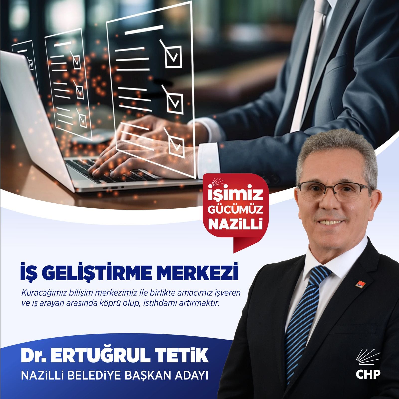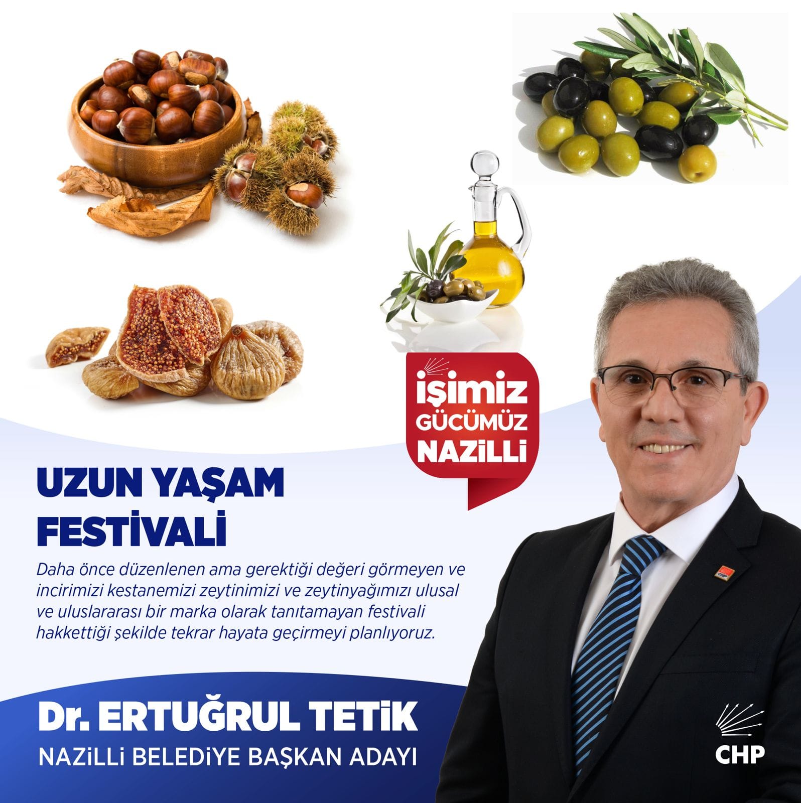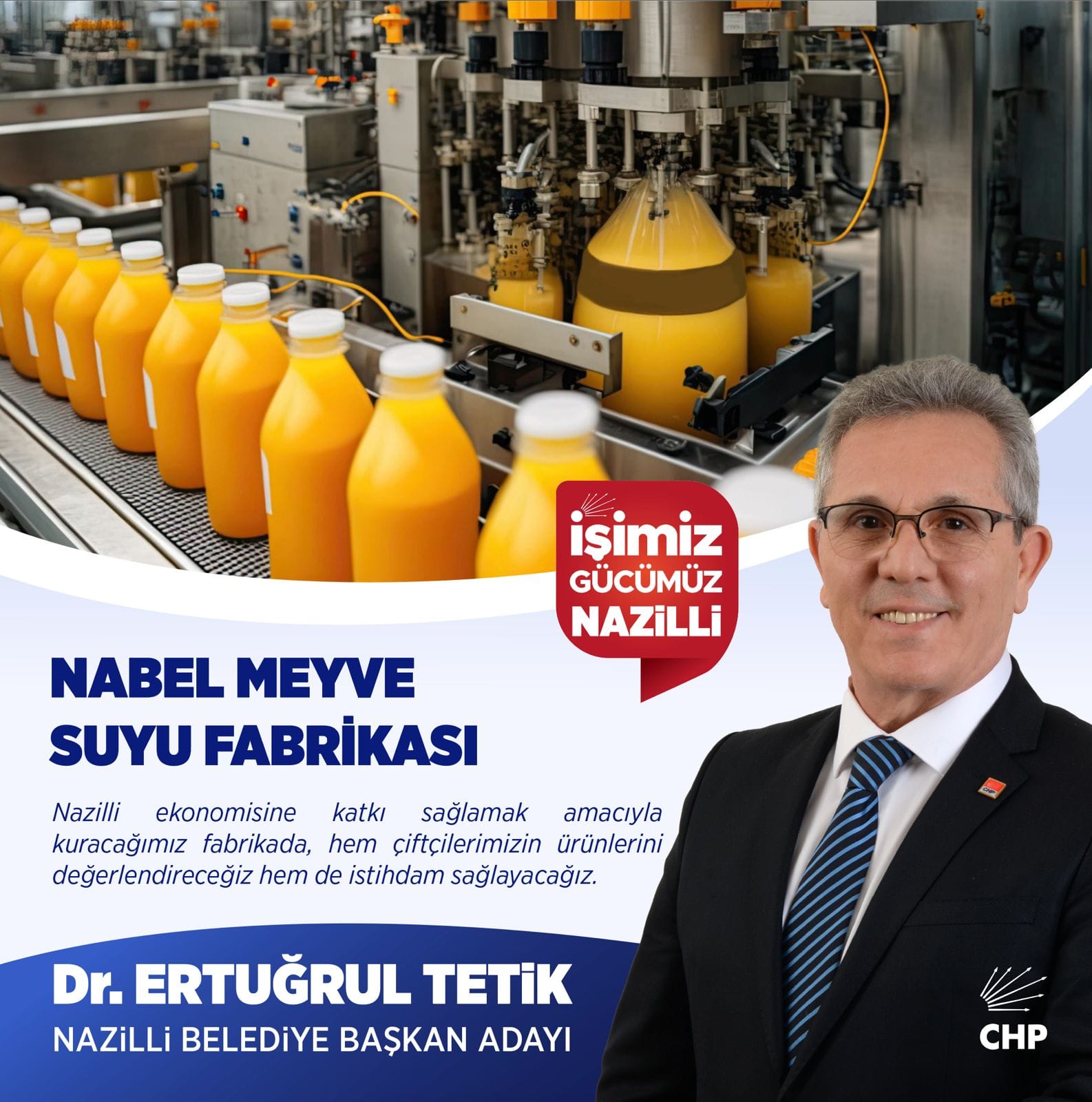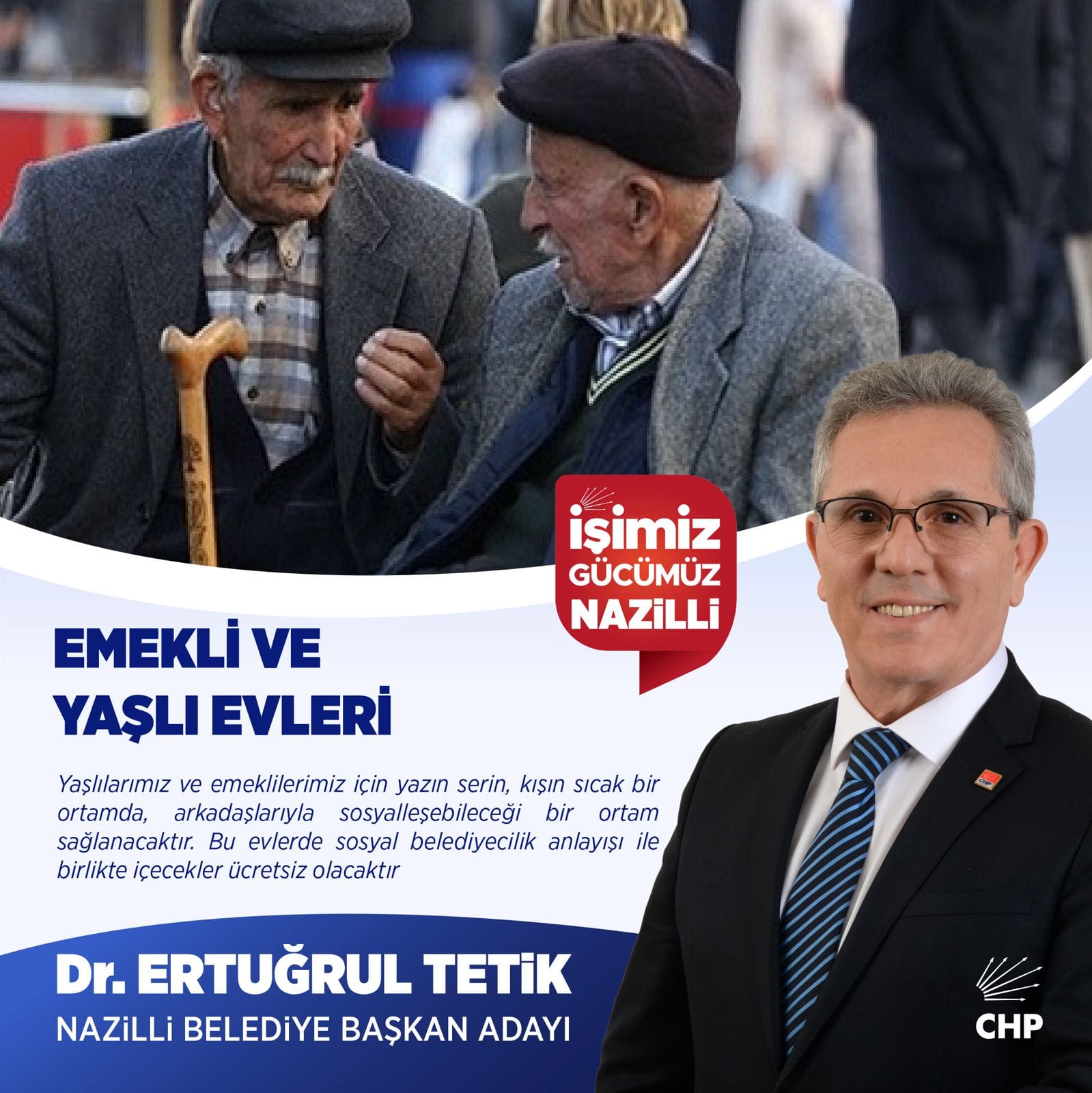 Yerel seçimlere 10 gün kala CHP Nazilli Belediye Başkan Adayı Ertuğrul Tetik projelerini açıkladı.Nazilli’yi daha modern bir şehir haline getirmek için titizlikle hazırlanan projeler ile ilgili son detaylar geçtiğimiz akşam İlçe Binasında yapılan toplantı ile gerçekleştirildi.Toplantı sonrası Tetik projelerini kamuoyu ile paylaştıİşte Ertuğrul Tetik’in ProjeleriAtatürk Kongre Merkezi, Taş ve Asfalt Fabrikası, Engelli yaşam köyü, Hayvan Dostu Merkezi, Sokak Lambaları ve Pazar yeri Projesi GES, Hoş Geldin Bebek, Mobil Sağlık Aracı, Refakatçi hizmeti, Bilim ve Gençlik Merkezi BİGEM, Gıda kart Eğitim Kart Projesi, NABEL meyve suyu fabrikası, Meslek fabrikası projesi, iş geliştirme merkezi, Gençlik Merkezi, Park ve Trafik sorunu, Engelsiz şehir ve Ulaşım, Afet yönetim Merkezi AYM, Nazım İmar Planı ve Çağdaş toplu konutlar, Organize Sanayi Bölgesi, Çevreci Belediye, Halkın Meclisi, Sosyal Projeler, Spor Desteği Projesi, Emekli ve Yaşlı Evleri, Kadın Sığınma Evi, Uzun yaşam Festivali, Ata Tohumu Takas Festivali, Kentpark, (Sümerpark) Mesire alanları,
