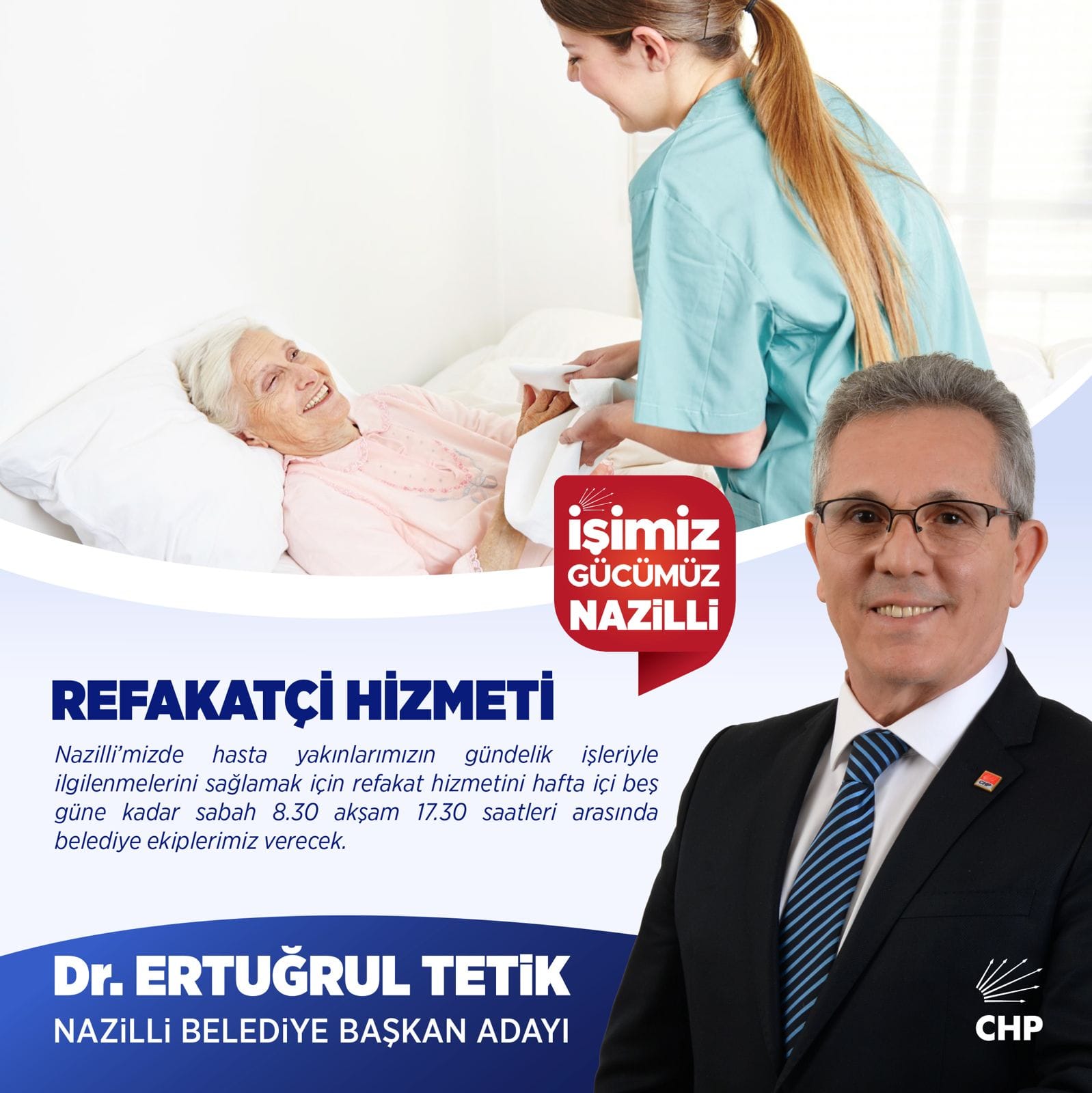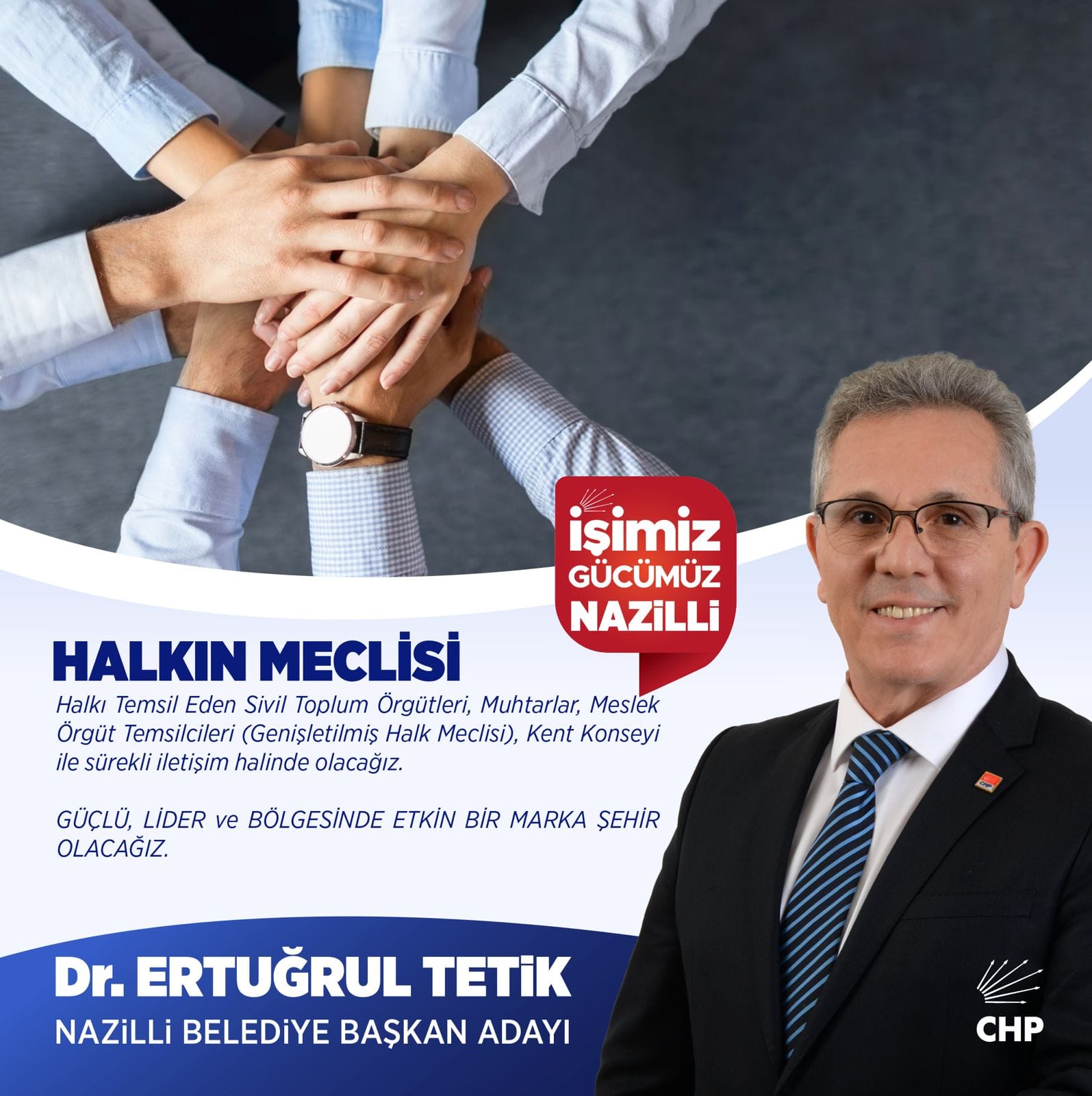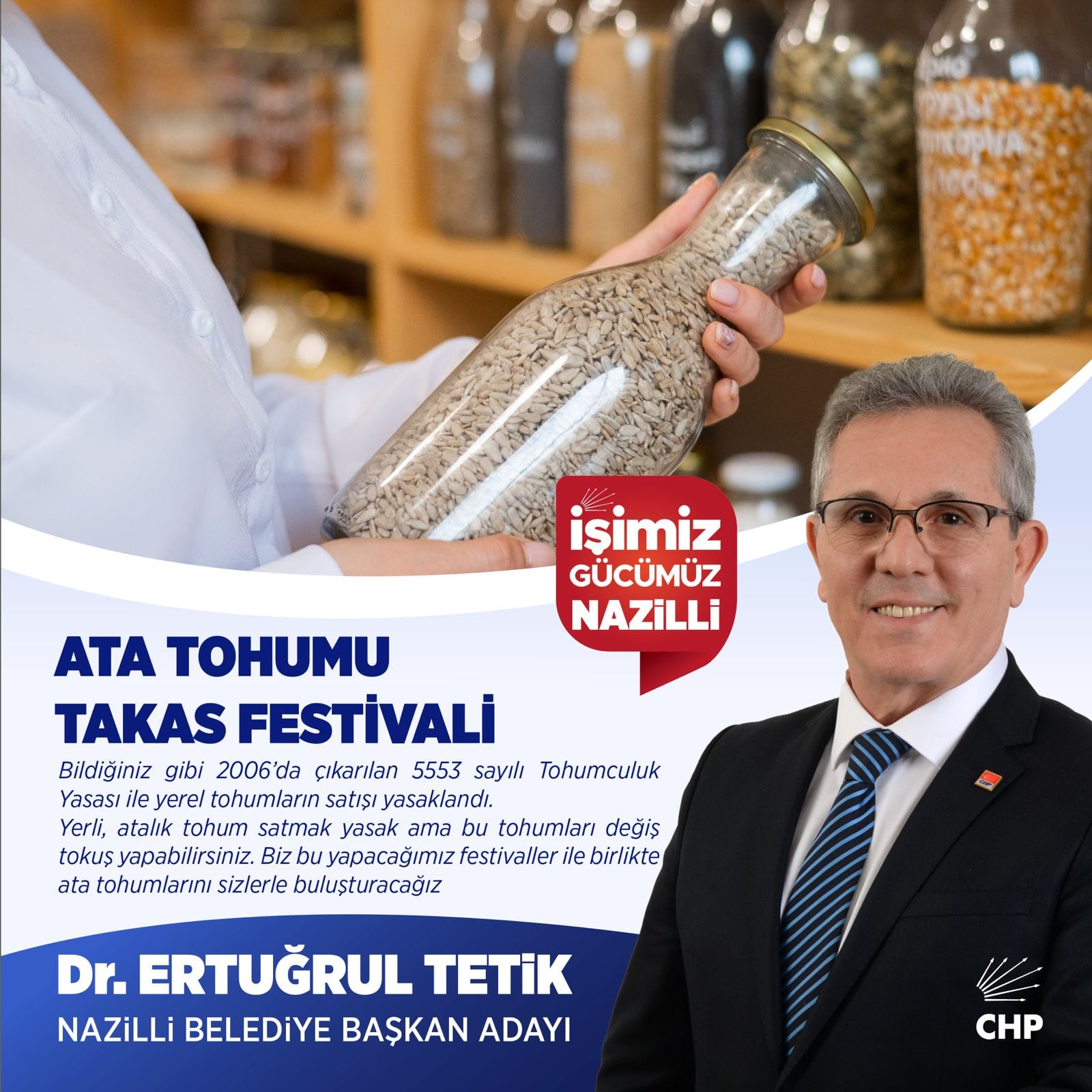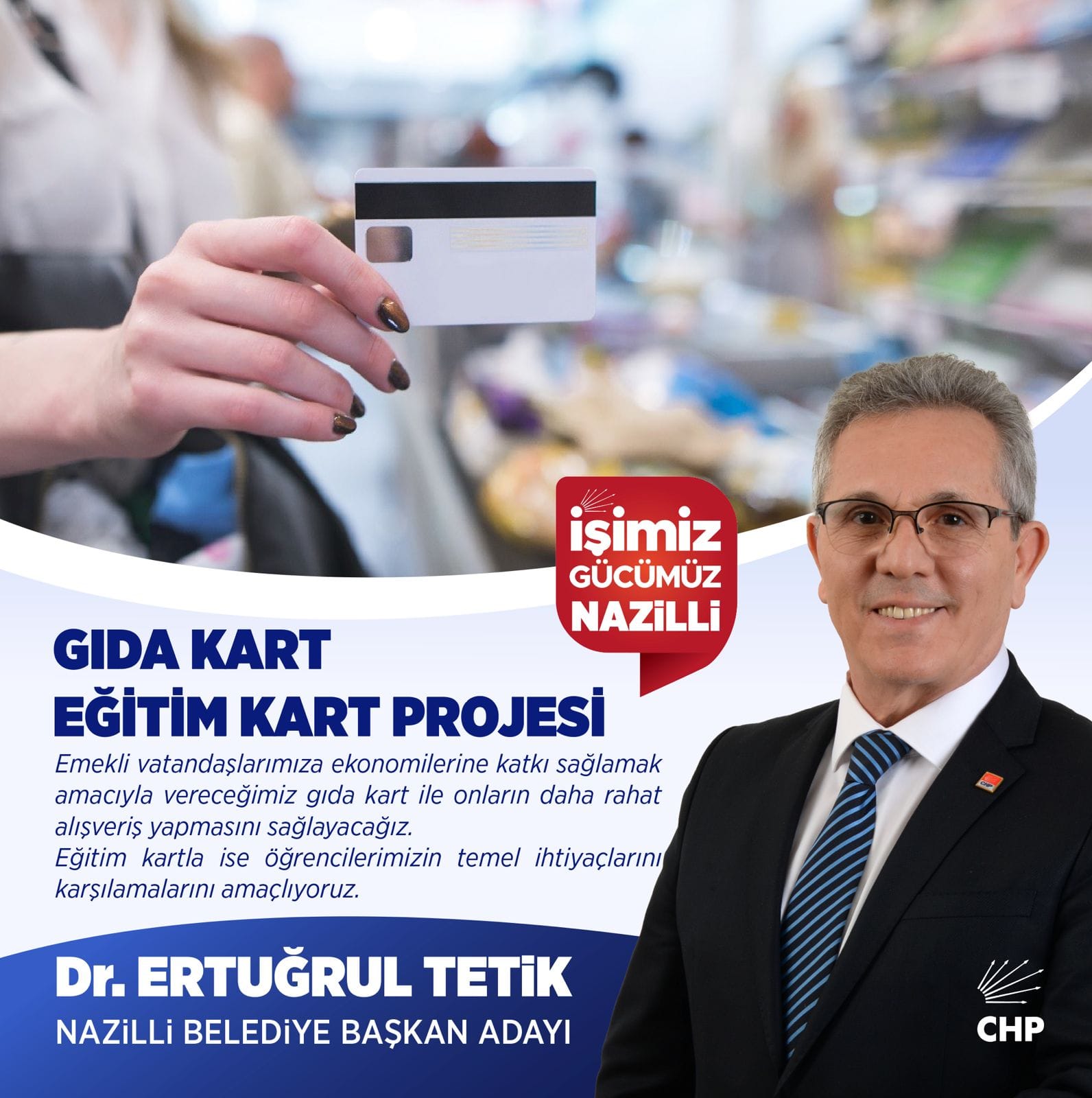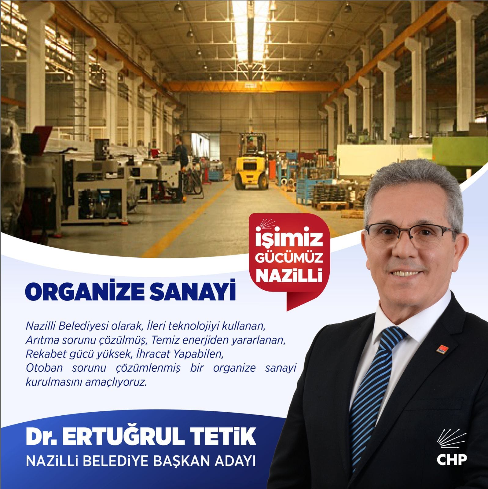 Yerel seçimlere 10 gün kala CHP Nazilli Belediye Başkan Adayı Ertuğrul Tetik projelerini açıkladı.Nazilli’yi daha modern bir şehir haline getirmek için titizlikle hazırlanan projeler ile ilgili son detaylar geçtiğimiz akşam İlçe Binasında yapılan toplantı ile gerçekleştirildi.Toplantı sonrası Tetik projelerini kamuoyu ile paylaştıİşte Ertuğrul Tetik’in ProjeleriAtatürk Kongre Merkezi, Taş ve Asfalt Fabrikası, Engelli yaşam köyü, Hayvan Dostu Merkezi, Sokak Lambaları ve Pazar yeri Projesi GES, Hoş Geldin Bebek, Mobil Sağlık Aracı, Refakatçi hizmeti, Bilim ve Gençlik Merkezi BİGEM, Gıda kart Eğitim Kart Projesi, NABEL meyve suyu fabrikası, Meslek fabrikası projesi, iş geliştirme merkezi, Gençlik Merkezi, Park ve Trafik sorunu, Engelsiz şehir ve Ulaşım, Afet yönetim Merkezi AYM, Nazım İmar Planı ve Çağdaş toplu konutlar, Organize Sanayi Bölgesi, Çevreci Belediye, Halkın Meclisi, Sosyal Projeler, Spor Desteği Projesi, Emekli ve Yaşlı Evleri, Kadın Sığınma Evi, Uzun yaşam Festivali, Ata Tohumu Takas Festivali, Kentpark, (Sümerpark) Mesire alanları,