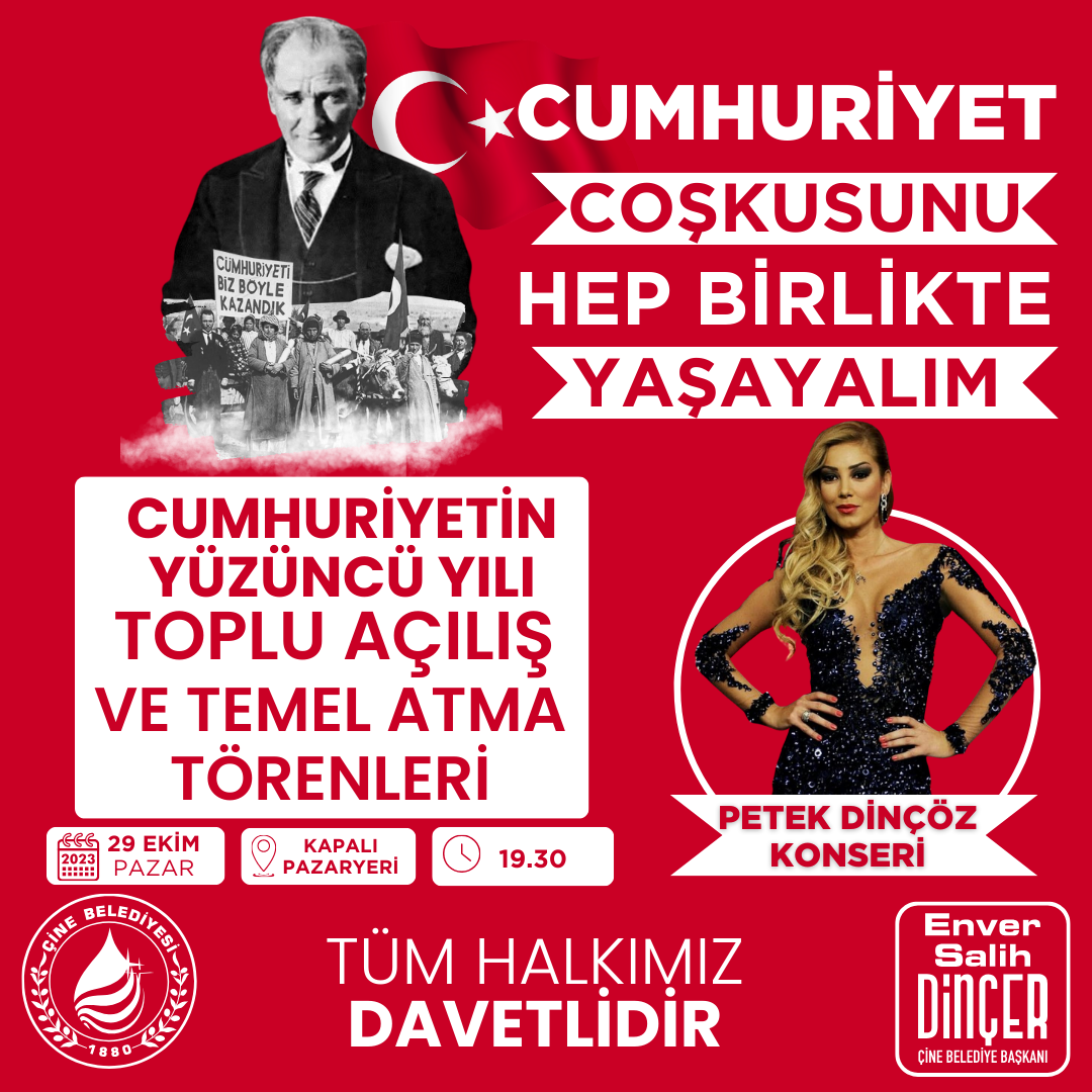 Cumhuriyet’in 100’üncü yılına özel birbiri ardına hayata geçirdiği projelerle ilçede adeta bir hizmet atağı gerçekleştiren Çine Belediyesi’nde Başkan Enver Salih Dinçer, 29 Ekim Cumhuriyet Bayramı coşkusunun toplu açılış ve temel atma törenleriyle devam edeceğini belirtti.29 Ekim Cumhuriyet Bayramı’nı çeşitli etkinliklerle kutlamaya hazırlanan Çine Belediyesi’nde Başkan Dinçer, bayram heyecanının toplu açılış ve temel atma törenleriyle taçlandırılacağını duyurdu. Cumhuriyet’in 100’üncü yılına özel vatandaşları yaz boyu Cumhuriyet konserleriyle buluşturan Başkan Enver Salih Dinçer, 29 Ekim Cumhuriyet Bayramı’na özel bir konserle de Çine halkının Cumhuriyet coşkusunu katlayacak. 29 Ekim Pazar günü Çine Belediyesi Kapalı Pazaryeri’nde saat 19.30’da toplu açılış ve temel atma törenleriyle başlayacak olan Cumhuriyet Bayramı heyecanı, aynı akşam ünlü şarkıcı Petek Dinçöz’ün sahne alacağı muhteşem bir konserle devam edecek.BAŞKAN DİNÇER’DEN TÜM ÇİNE HALKINA DAVETCumhuriyetin 100’üncü yılına yakışan projeleri hayata geçirerek etkinlikler düzenlediklerini belirten Başkan Dinçer, “Cumhuriyet’imizin 100’üncü yılını kutladığımız bu özel gün, Çine Belediyesi olarak ilçemizdeki yatırımlara yenilerini eklemek, vatandaşlarımızla birlikte bayram coşkusunu daha özel kılmak için de bir fırsat oldu. Bu nedenle Cumhuriyet’imizin 100’üncü yılına yakışan hizmetlerimize devam ediyor, vatandaşlarımızın refahı için yeni projelerimizi hayata geçiriyoruz. İlçedeki yatırımlarımızı Çine halkımızın huzurunda toplu açılış ve temel atma törenlerimiz ile paylaşacak olmanın mutluluğu içindeyken ayrıca vatandaşlarımızın alışık olduğu ve bizlerden beklediği gibi 29 Ekim Cumhuriyet Bayramı coşkumuzu konserle taçlandıracağız. Tüm Çine halkımızı toplu açılış ve temel atma törenlerimize ve Petek Dinçöz’ün sahne alacağı Cumhuriyet konserimize davet ediyor, şimdiden herkesin bayramını kutluyorum” diye konuştu.