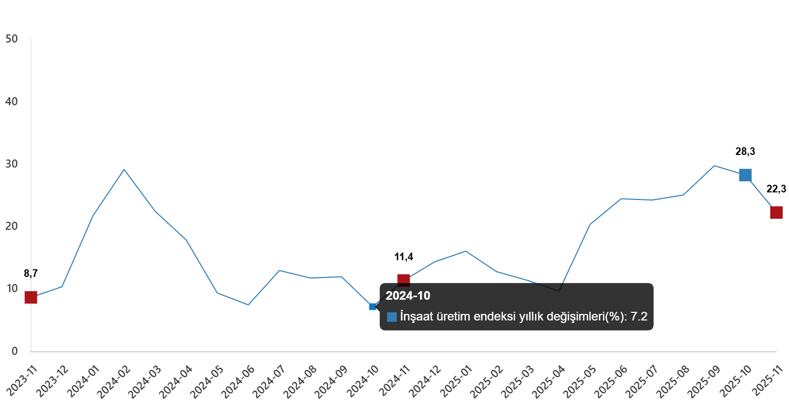 İnşaatın alt sektörleri (2021=100 referans yıllı) incelendiğinde, 2025 yılı Kasım ayında bina inşaatı sektörü endeksi bir önceki yılın aynı ayına göre %23,4 arttı, bina dışı yapıların inşaatı sektörü endeksi %16,7 arttı ve özel inşaat faaliyetleri sektörü endeksi %22,5 arttı.