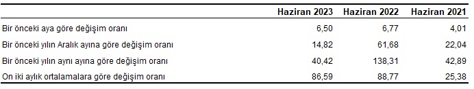 Ana sanayi gruplarının yıllık değişimleri; ara malında %36,50, dayanıklı tüketim malında %47,00, dayanıksız tüketim malında %62,00, enerjide %10,26 ve sermaye malında %52,44 artış olarak gerçekleşti.Yİ-ÜFE yıllık değişim oranı (%), Haziran 2023