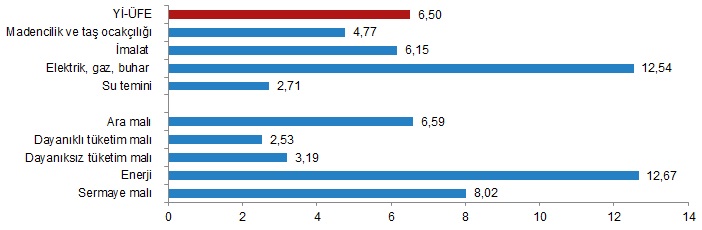 Aylık en yüksek azalış; %6,68 ile ham petrol ve doğal gaz, %0,08 ile kömür ve linyit alt sektörlerinde gerçekleşti. Buna karşılık kok ve rafine petrol ürünleri %18,15, metal cevherleri %13,65, elektrik, gaz, buhar ve iklimlendirme %12,54 ile endekslerin en fazla arttığı alt sektörler oldu.Sektörlere göre Yİ-ÜFE aylık değişim oranları (%), Haziran 2023